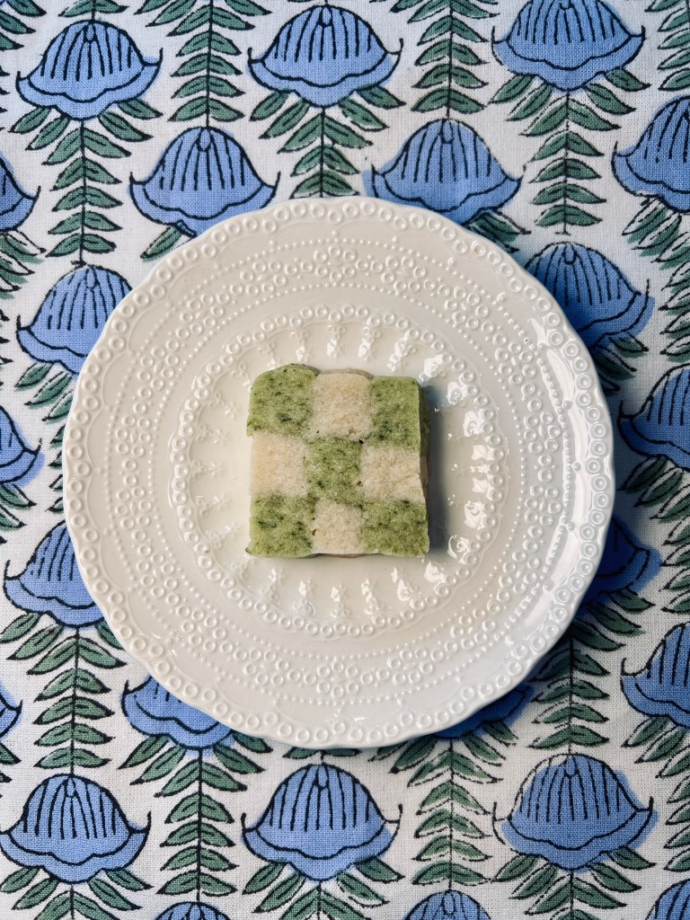 Each cookie was a geometric masterpiece made up of 9 tiny squares, alternating between pale green and off-white. You could break the cookie in half, or break off an individual cube to try each flavor independently. Lined up next to one another, the cookies looked like green-and-white gingham. The embodiment of a spring picnic, cherry blossoms, and freshly sprouted blades of grass.