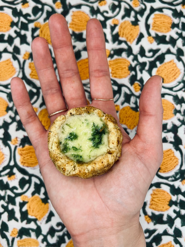 - Fill each cookie-cup with a scant teaspoon of the filling. Top with a pinch of cilantro sugar.