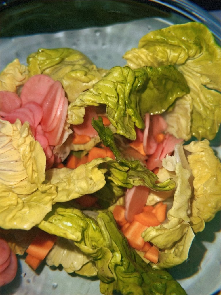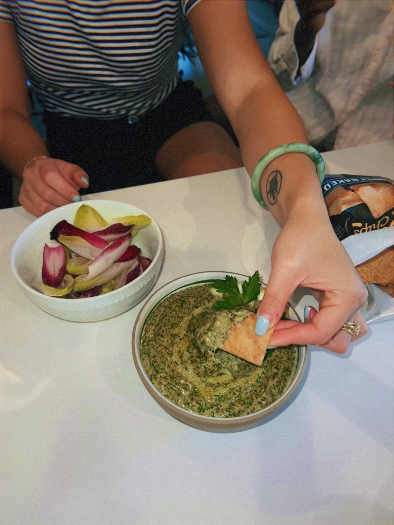 - Salad with green goddess dressing (dill) topped with scallions, radish, and toasted sunflower seeds