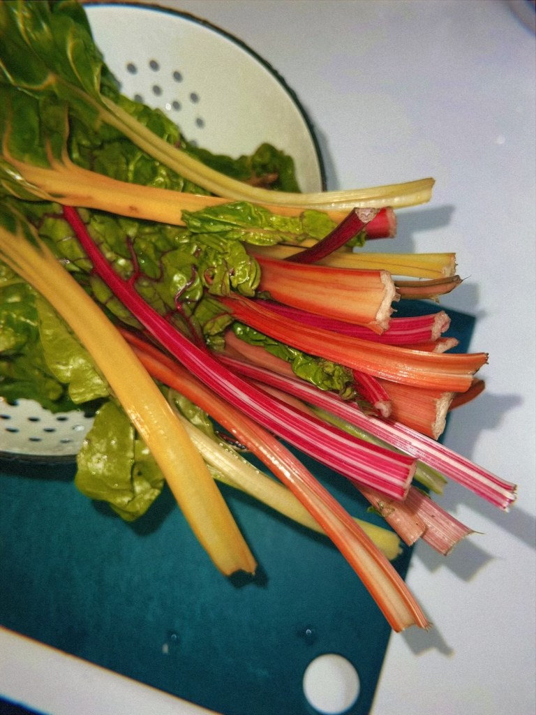 Rainbow chard is aptly named. With each stalk a varying ombre of pink, orange, and yellow, it is definitely among the class of super-model veggies. As pretty as it is, I have to admit I had no idea what to do with it other than stick it in a pan and let it cook down with some olive oil and garlic. That felt uninspired, however, and I was anxious about letting the vibrant stalks go to waste (most recipes ask you to “remove the ribs”). So, when I came across this recipe for Swiss Chard Tahini Dip, I was simultaneously relieved that it called for the entire swiss chard, stalk and all (yay no food waste!) and disappointed that the colors would be lost to the food processor.