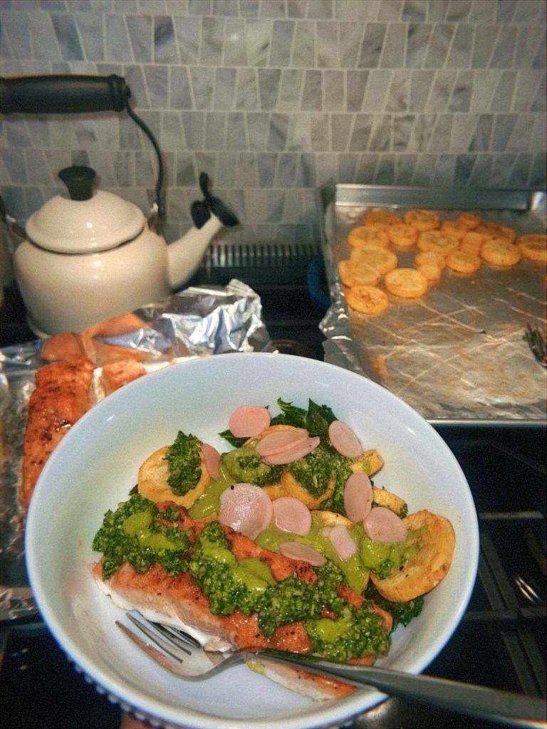 - Roasted squash and kale served with salmon and un-frozen cilantro pesto from CSA week one