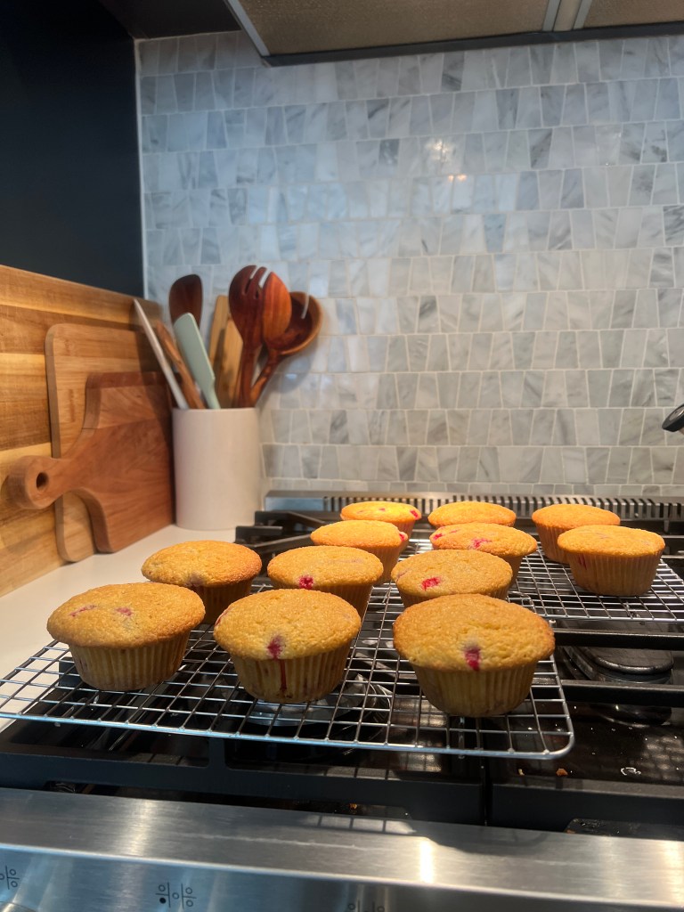 Then, I caught a glimpse of some delicious looking corn muffins on Dan Pelosi aka Grossy Pelosi’s feed. I was instantly inspired: why not add red currants to the muffin batter? Tart currants meet sweet, toasty corn – a perfect flavor match!