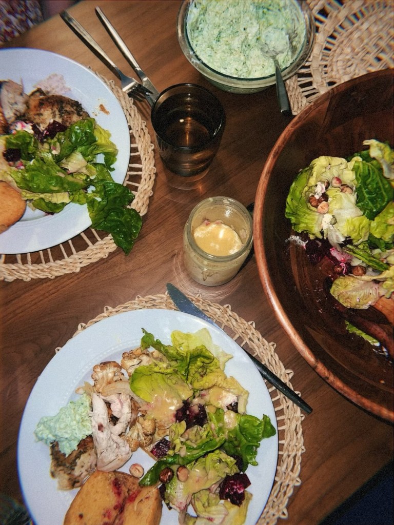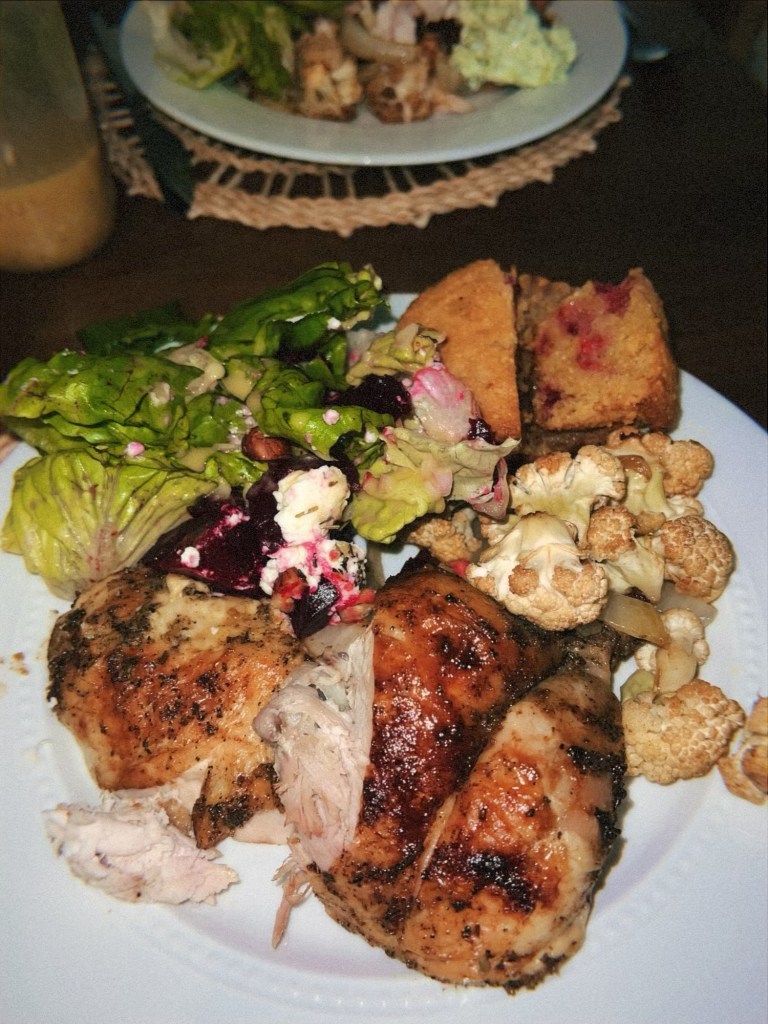 - Roasted beet and cauliflower salad with fresh lettuce and goat cheese