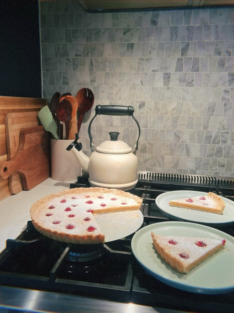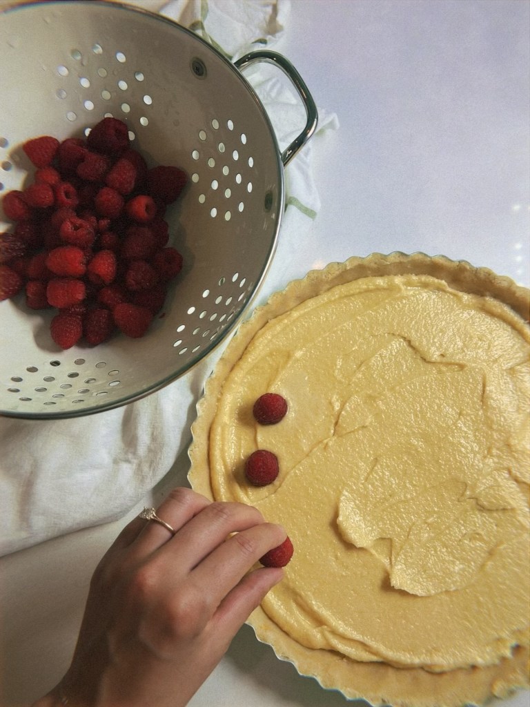 Even though we had just cooked lunch, we said fuck it. We cleaned up and I immediately got to work on crafting dessert. We had raspberries from week 5 and it immediately brought back memories of early pandemic baking inspired by everyone’s feel-good-favorite reality tv show: The Great British Bake-off (or GBBO for the real ones). One of our favorite things to make during lockdown was Mary Berry’s frangipane tart. These were also during the days before I had a baking scale, so for a time I had a note on my phone where I had converted the measurements from grams to cups and tablespoons (and a note that converted the baking temperature from Celsius to Fahrenheit). Her recipe calls for the addition of pear, but we found that it works just as well with raspberries.