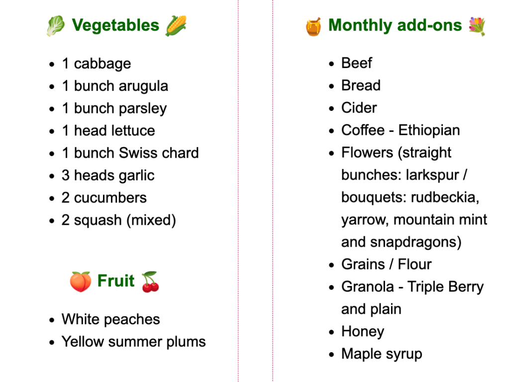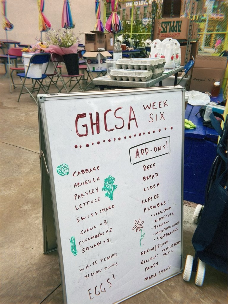 Week 6 was also the first time for monthly add-ons (this was an option presented at sign-up). It coincided with our volunteer shift – every CSA member has to work the CSA at least once, including unloading the truck, divvying up the produce, and distributing it to members coming to pickup. We had only signed up for the beef supplement, but as soon as we saw the various add-on vendors arrive one-by-one, I felt a slight pang of regret. Talk about a bounty! Buckets of fresh flower bouquets, boxes filled with locally milled flour and homemade granola, honey from upstate bees and maple syrup from upstate trees. There was coffee and cider and golden loaves of She Wolfe sourdough bread. The Habana Outpost courtyard was a veritable farmer’s market.