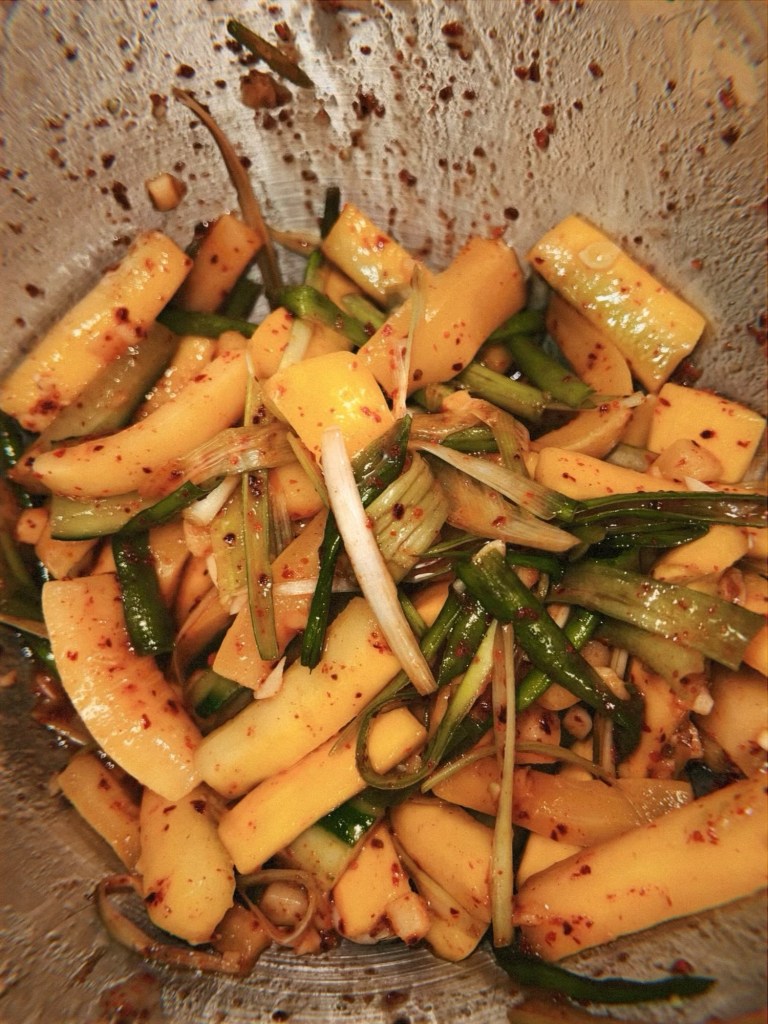 For both, once you finish brining, you mix it all together with your other ingredients (green onion, ginger, carrot, garlic), gochugaru (Korean chili flakes), fish sauce, and a glutinous rice paste that you make by cooking down rice flour and water.