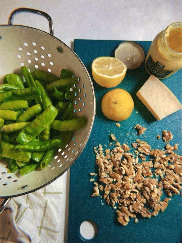 - Snow pea and snap peas walnut parmesan salad