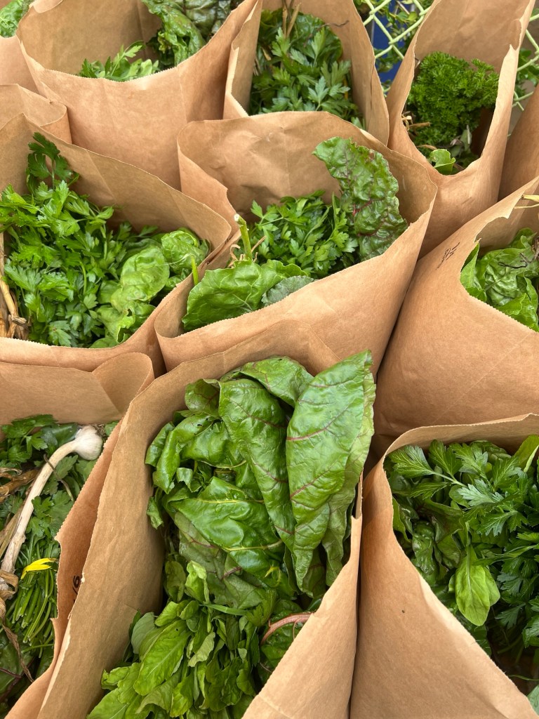 After unloading, we had to start dividing it up into individual shares, packaged in brown paper bags. Once again, assembly line for the win – I was on zucchini, cucumber, and cabbage duty. My fellow volunteers and I chatted as we packed up the bags. I’ve joked for a long time that my ideal job is “farmer’s market”, not really specifying what it would entail. After this volunteer shift, however, I think it probably looks a lot like working at the morning CSA pickup.