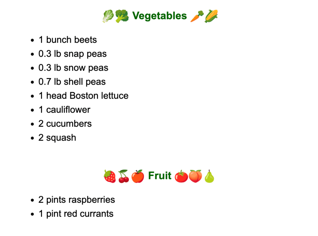 We knew that week 6 would be a short one as we would be leaving for a trip – Dev was leaving the next morning and I would meet him later that week. Seeing all the delicious CSA items that he might miss out on (and that I also would never be able to consume alone), I developed a plan that optimized our ability to enjoy this peak summer produce: