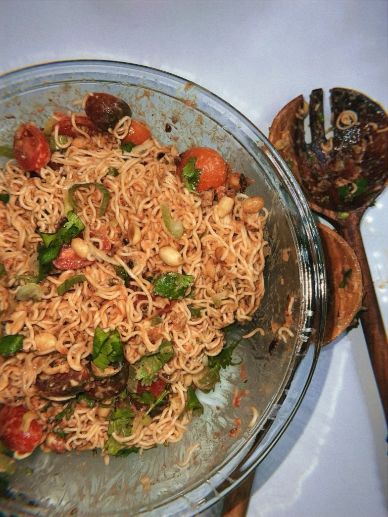 The first night, I made a cold noodle salad with peanut sauce, chock-full of tomatoes. I was initially skeptical as I prefer my savory food to be served on the warmer side, but I trusted the process and the combination of acidic tomatoes, rich, spicy sweet peanut sauce (chili crisp was a key ingredient) won me over. The cold noodles were refreshing – a perfect meal on a sweaty summer evening.