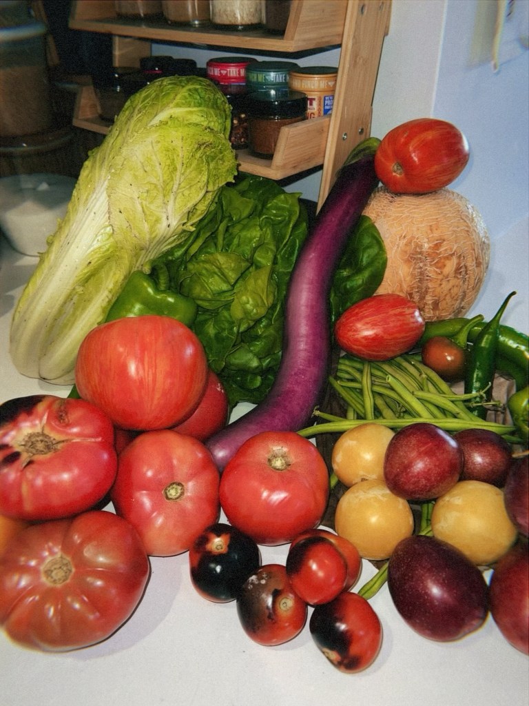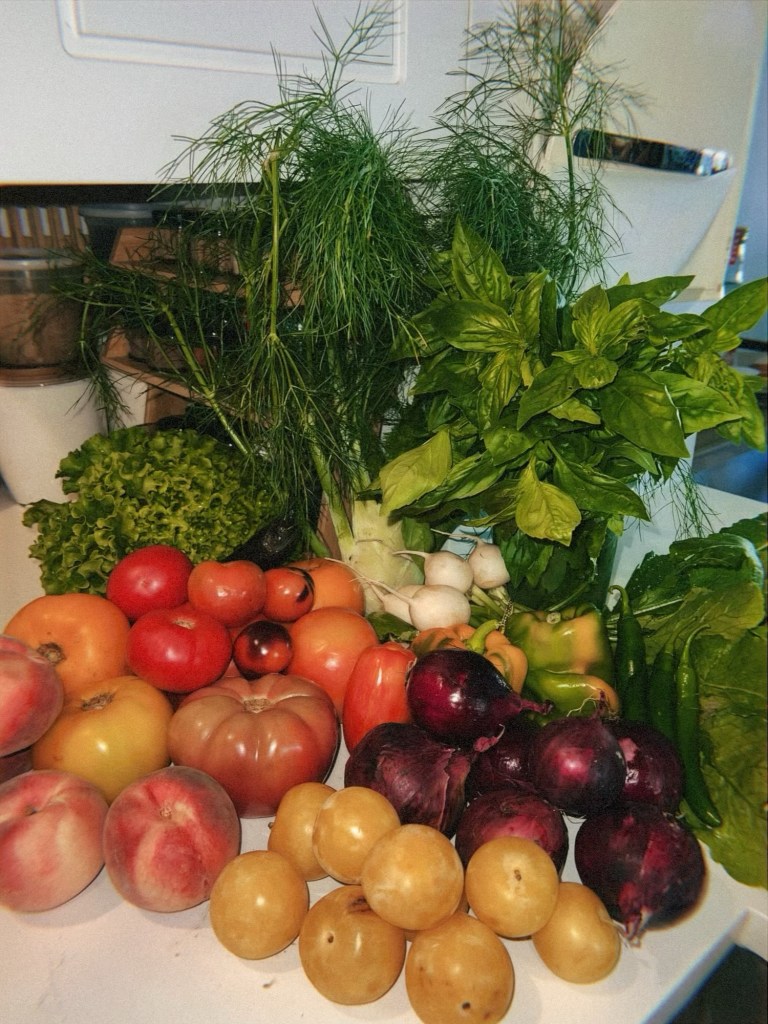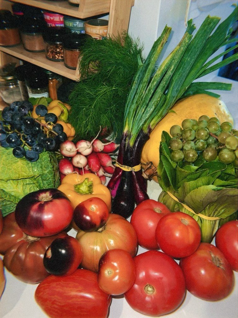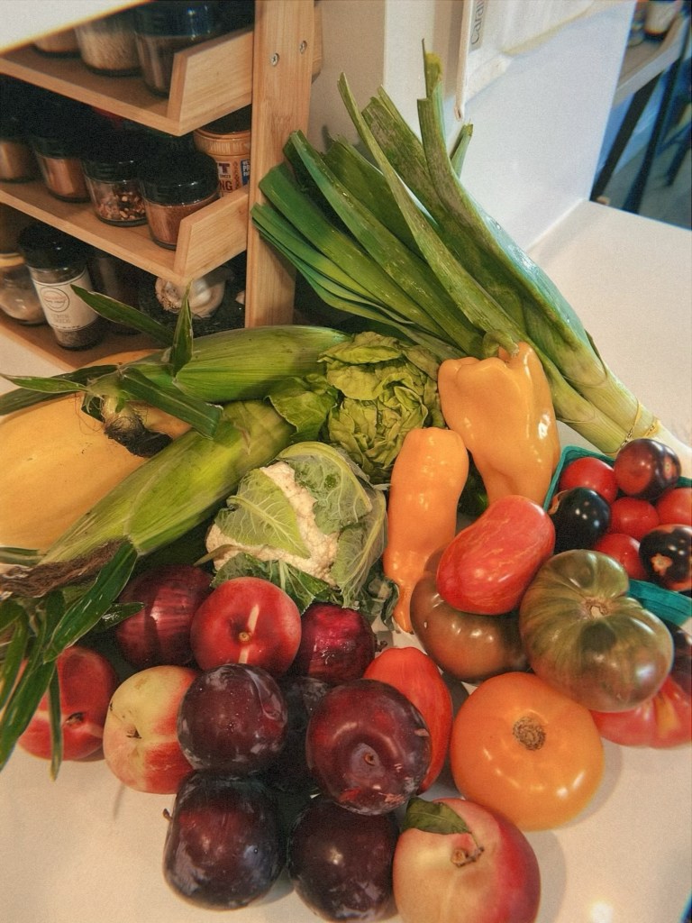 Week twelve of Greene Harvest’s CSA was the first week of heirloom tomatoes. I was beyond excited to see what was in store. For the next four weeks, we would be the lucky recipients of farm-fresh heirloom tomatoes. In addition to this bonus bounty we also could look forward to the usual late summer suspects: stone fruit, corn, eggplant, and fresh herbs. We also started to see a sneak preview of fall: leeks, onion, and squash.