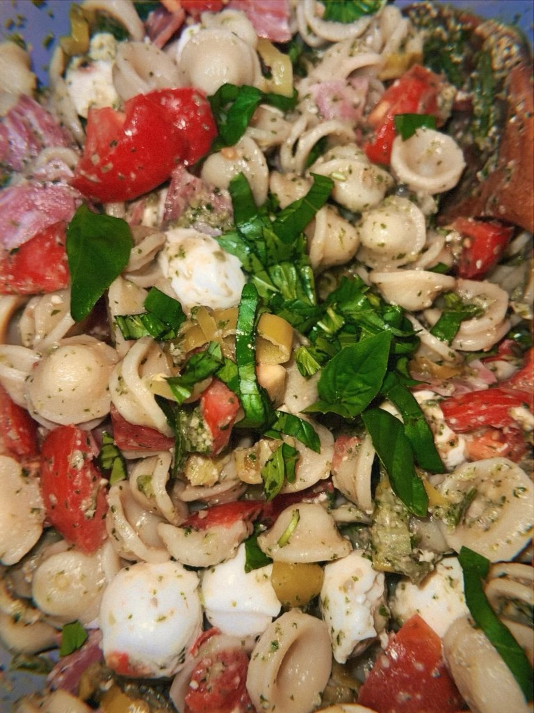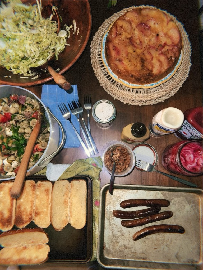 - Caprese pasta salad featuring freezer-pesto, mozzarella pearls, sliced salami, and sliced heirlooms. This was a side for our Labor Day menu, featuring a miso cabbage slaw, an upside down peach cake, and the BEST hot dogs I’ve ever eaten (courtesy of our CSA beef-add-on).