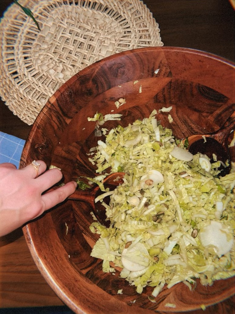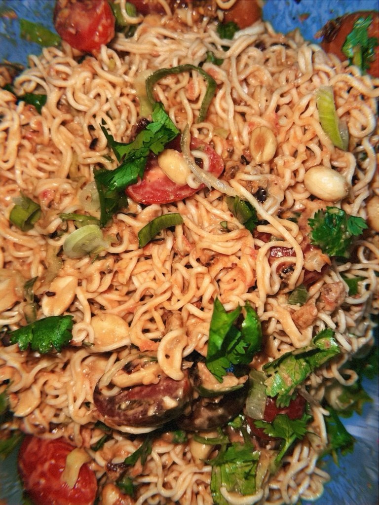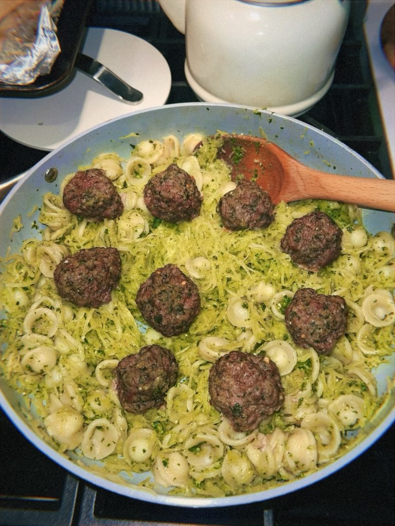 - Spaghetti squash with pesto pasta and pesto meatballs – for some reason, every single spaghetti squash recipe heavily features cheese. As my partner is dairy-avoidant, I came up with the idea to mix it with half a bag of pasta, coat it in pesto, and serve it with pesto meatballs. This was brilliant and I would 100% make this again. Delicious.