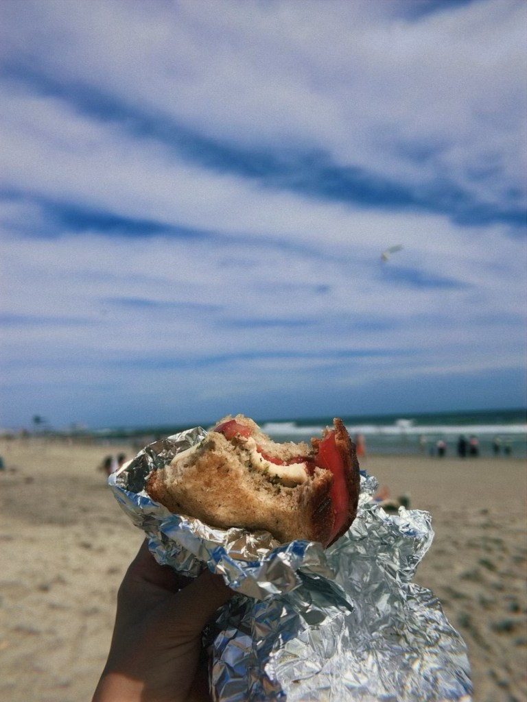 - The Beach Sando: tomatoes (sliced), cheddar cheese, salami, and pesto mayo on toasted sourdough bread; wrap in foil and enjoy beachside with salt and vinegar chips.