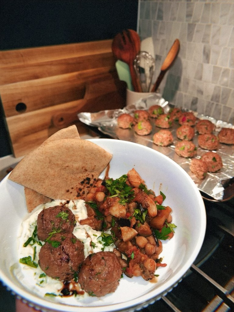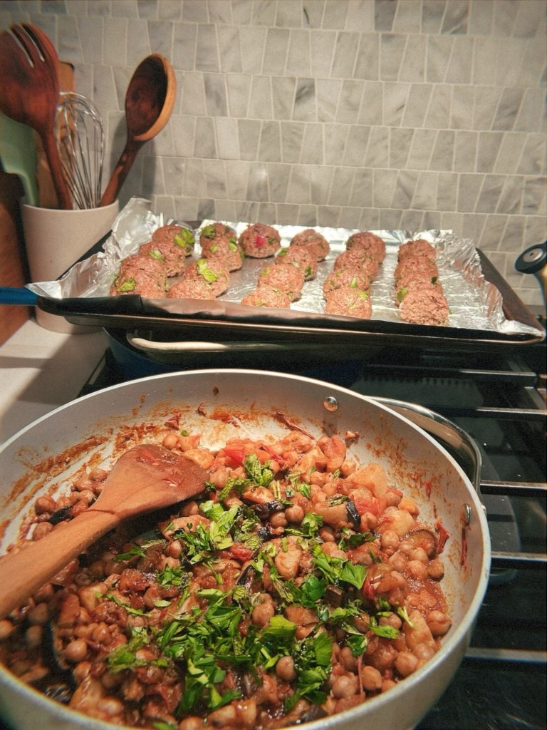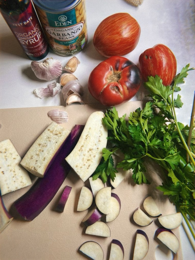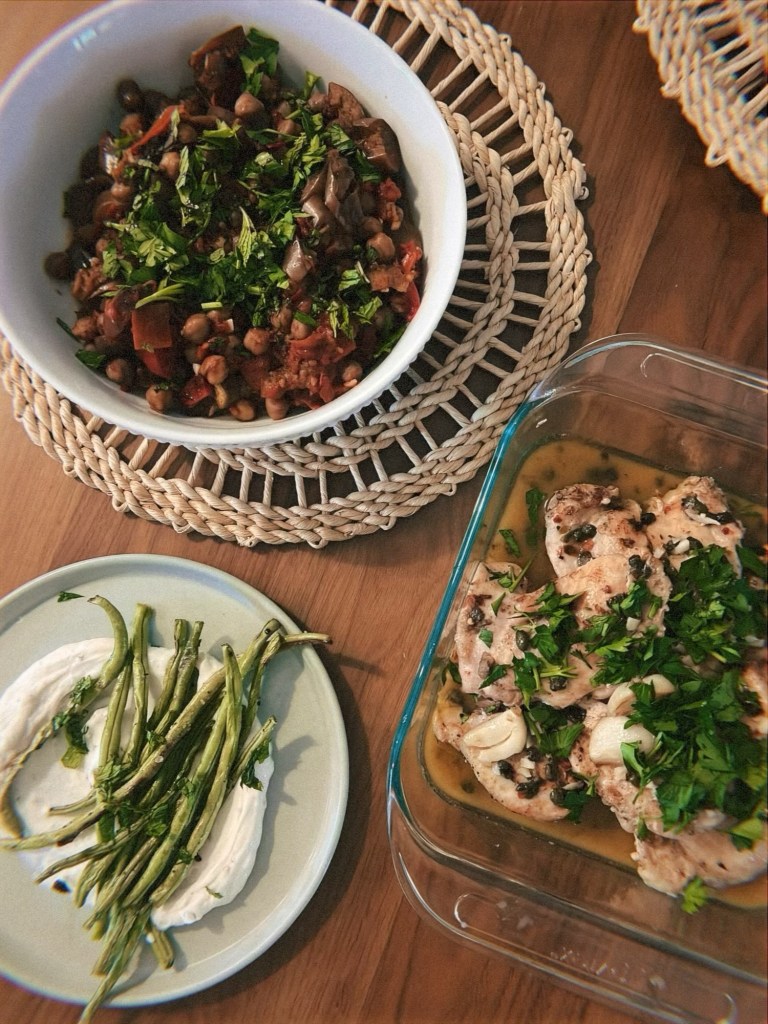 - Sweet and sour eggplant, tomatoes, and chickpeas – this recipe is a great way to use up several CSA items all in one go, is high in protein (hello, chickpeas), and features one of my new favorite condiments: pomegranate molasses. We’ve made this recipe multiple times. One time as part of a Mediterranean week-night menu alongside charred green beans and lemony yogurt and garlicky chicken with lemon-anchovy sauce – 10/10, great meal. Another time alongside kofta and a cucumber tzatziki sauce – 10/10, another great meal.
