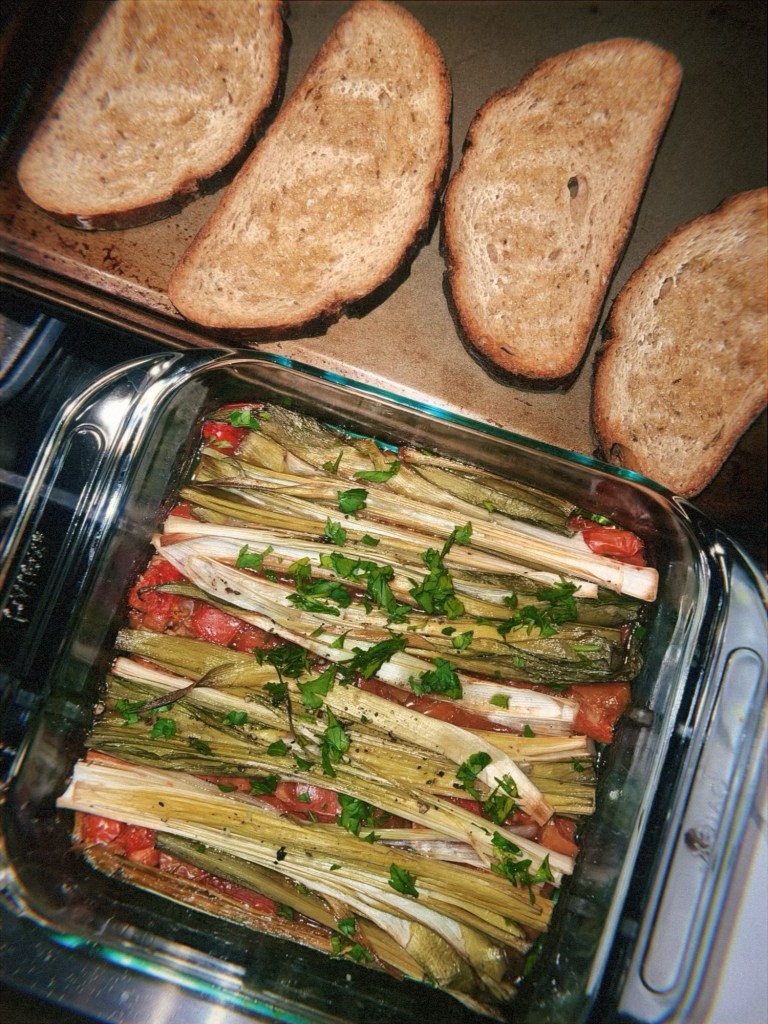 - NYT cooking features a 5-star recipe for Tomato Leek Gratin that helped me use up some aging tomatoes and leeks. Shockingly simple, all you do is cook tomatoes and leek in the oven and serve with bread.