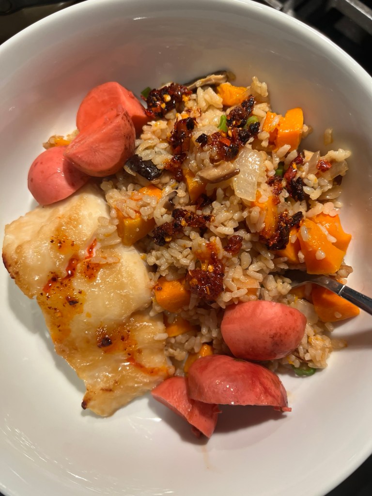 The actual last meal we made with our CSA ingredients came in early December when I finally decided to use up the Last Butternut Squash. It had been sitting on our counter for a bit and needed to be eaten. I wasn’t sure what to do with it until I realized we had a lot of leftover rice in our fridge that also needed to be eaten or tossed. In our house, leftover rice = fried rice and so I decided we should combine the two orphaned ingredients together: squash fried rice! Surprisingly, there aren’t many recipes for this sort of thing online, but I found one for Kabocha squash fried rice featuring onions and shitake mushrooms. I subbed in the butternut squash (roasting it beforehand to speed up the process), and served it alongside miso glazed cod and pickled radishes. It was cold outside and we had been traveling nonstop so sitting down to this warm home cooked meal was particularly comforting. Also, people need to know that squash is a great addition to fried rice and I’ll be making this again soon.