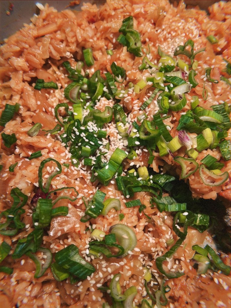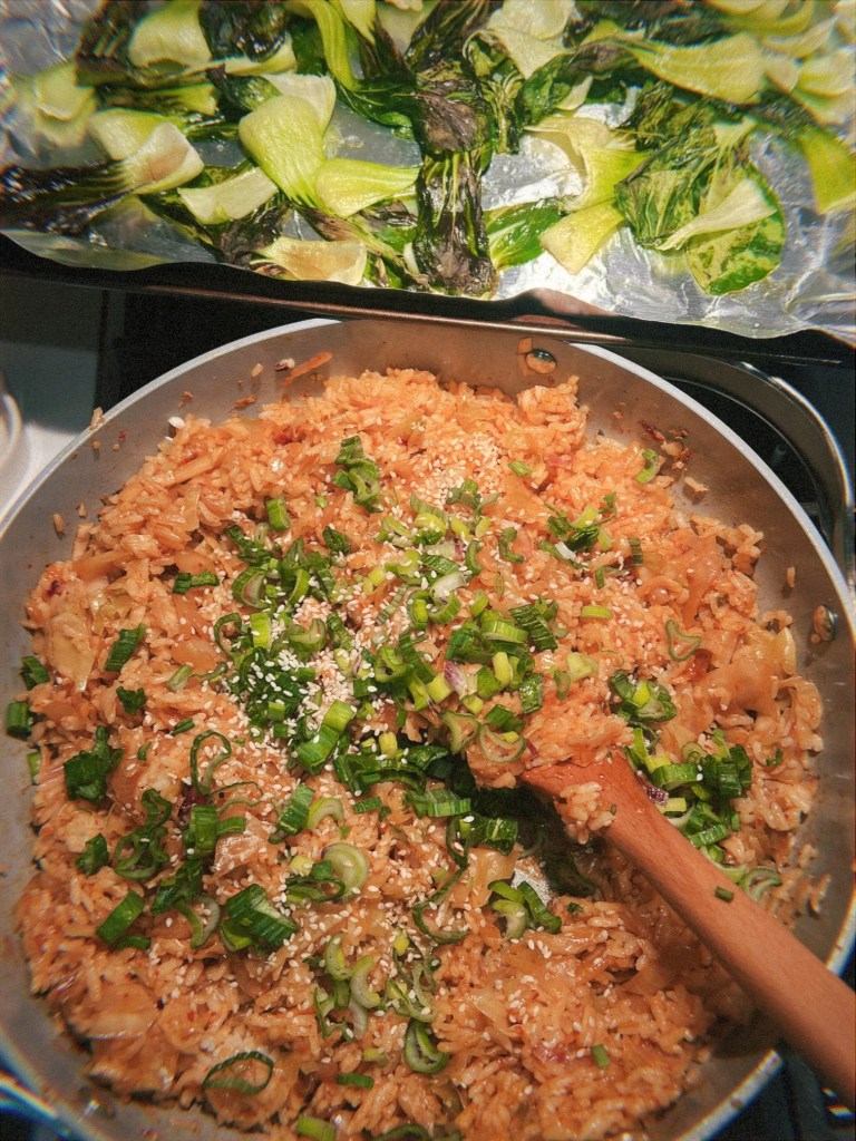 During the pandemic, my partner and I learned how to make kimchi via a virtual cooking class. Earlier in the summer, I made some with CSA cabbage. Kimchi does keep for a while, but eventually I decided we needed to use-up the last of ours. So, I turned to one of our favorite dishes: kimchi fried rice. We also had some beautiful CSA bok choy to roast up alongside it and with a fried CSA egg on top, this truly is one of my favorite meals.