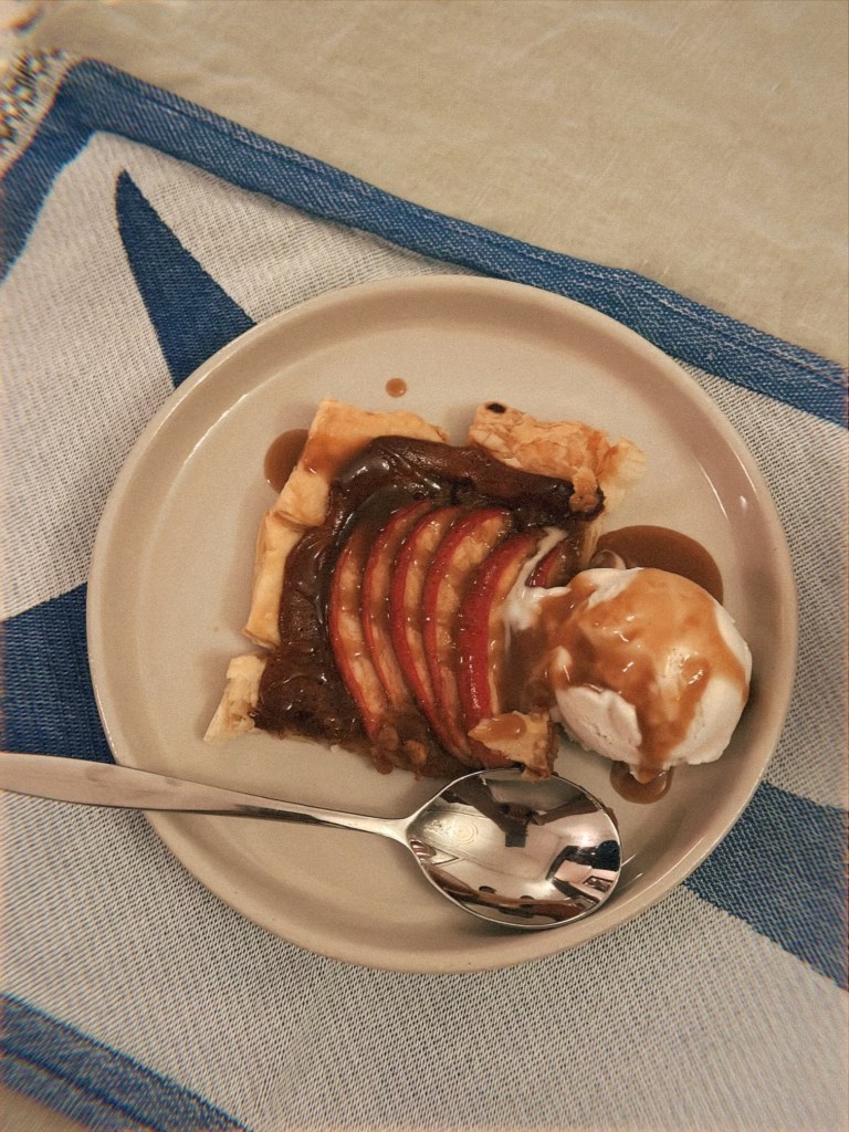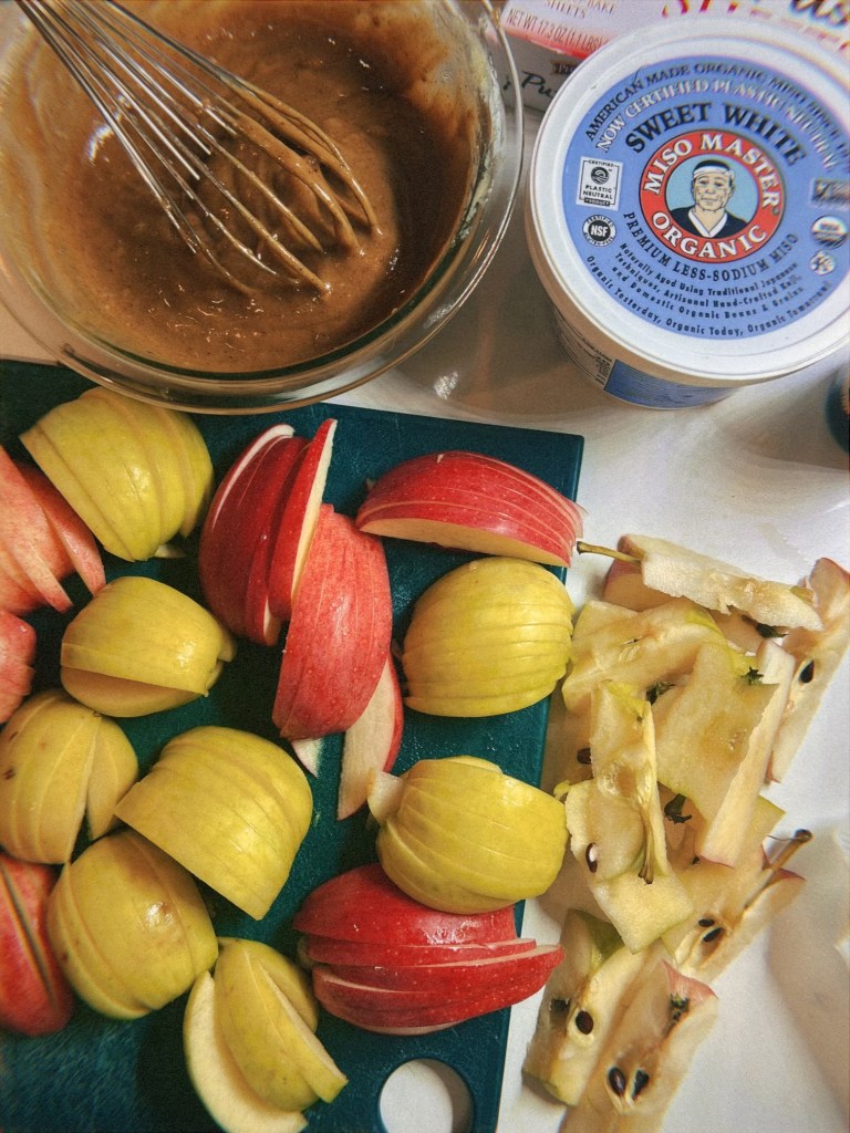 Molly Baz has a recipe for an apple miso tart in her first cookbook, Cook This Book. I’ve made it a few times because it looks impressive but is so easy! The secret: freezer-aisle puff pastry. I decided to make it for a dinner party to use up our endless supply of CSA apples (a New York fall staple), but found myself short on almond butter. So, I subbed in something I always have on hand: tahini. I think it worked! And it also gave me a chance to show off my ever-improving knife skills.