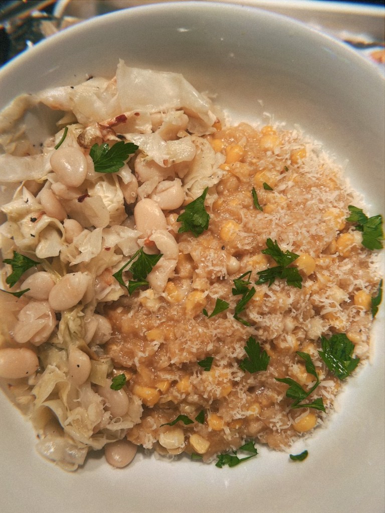Sweet summer corn can sometimes turn into sweet early-fall corn and when that happens, it’s the perfect time to make corn risotto. While we did not do the extra work to make stock from the cobs (risotto is already quite a bit of work and as Ina Garten says, store-bought is fine), the final risotto was creamy, slightly sweet, and full of juicy corn kernels. When topped with a mountain of parmesan, what more could you want?