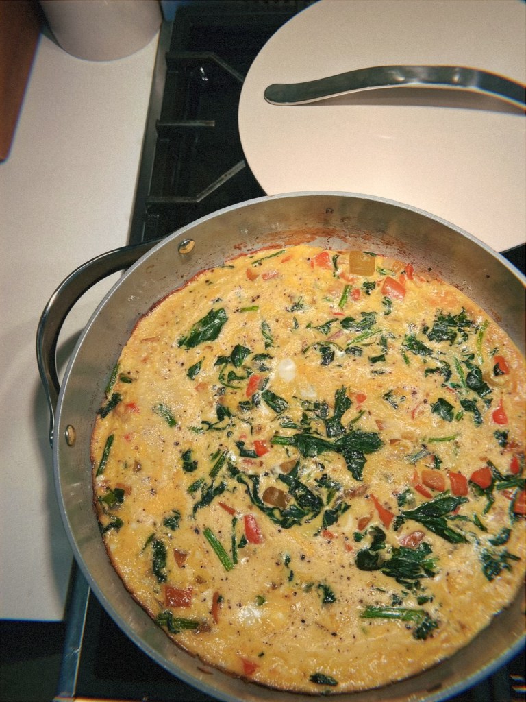One thing we never were able to keep up with (and still haven’t – as I speak we have 3 cartons in the fridge) were the CSA eggs. We’re not breakfast people, I don’t mind a hard boiled egg but don’t have the foresight to prep them, and I never got around to making lemon curd (a great way to use up a whole lotta yolks!) One obvious answer to this is the frittata – your average frittata recipe can use up to a dozen eggs, is a great way to clean out unused veggies in the fridge, and is fast and easy to make. So one day I finally decided to make one. In went a carton of CSA eggs, some sad CSA spinach, and a few CSA peppers that were wrinkly but still flavorful. I topped the whole thing with a generous smear of goat cheese and ate it with a slice of toast covered in grape jelly.